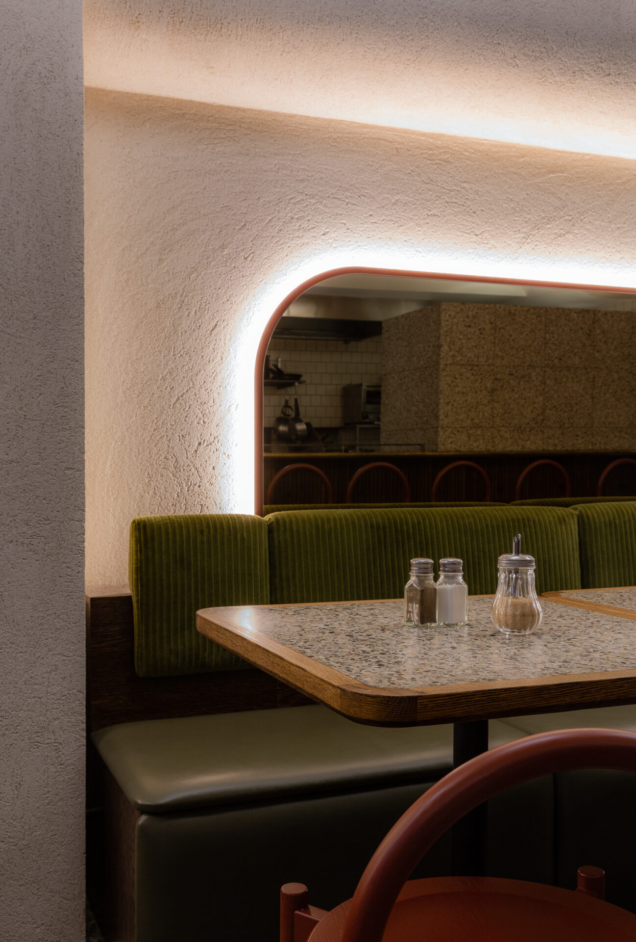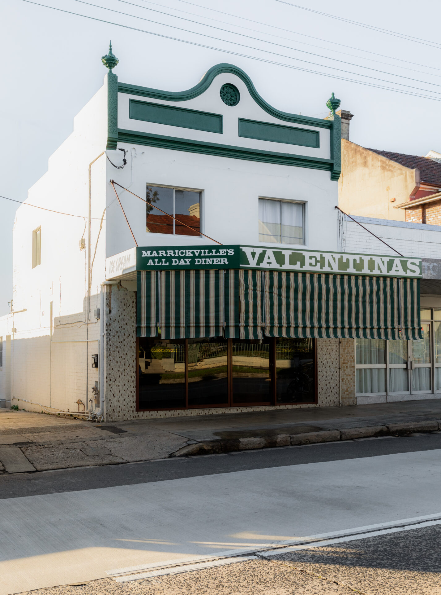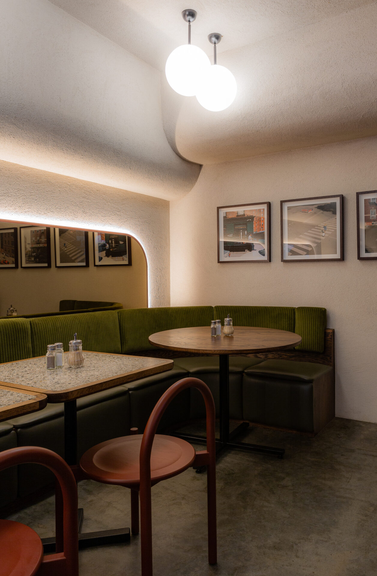 The project involved the build of a central dining space, elevated bar seating and installation of a commercial kitchen. Custom joinery, olive green banquet seating, terrazzo floors and curved stucco ceilings and brass fixtures give Valentinas its 70’s vibe.